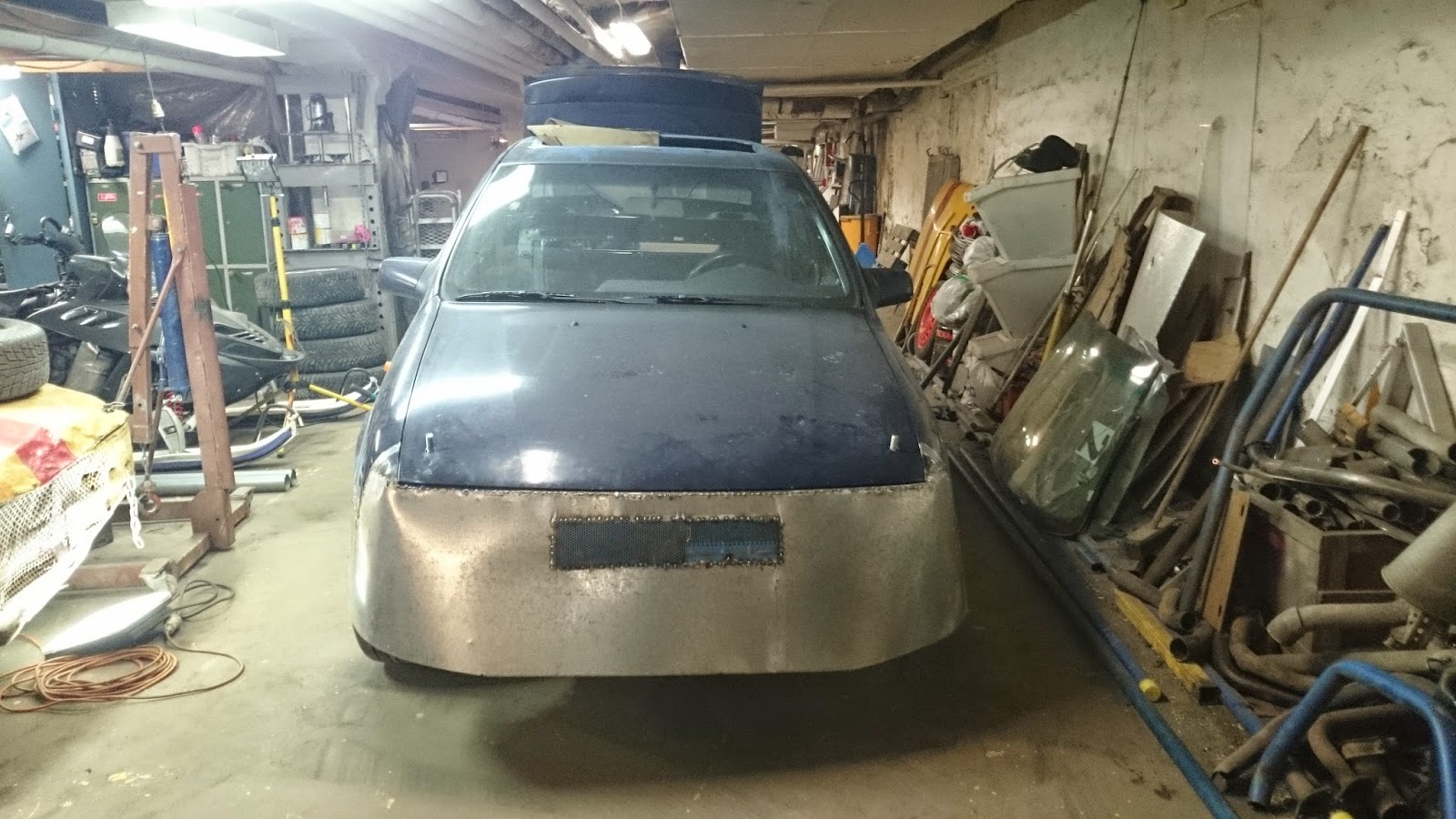 Vi svetsade helt enkelt en plåt dit från kant till kant, böjde plåten och svetsade. Bilen blir inte jättesnygg när man gör så men det går fort och är ganska lätt att byta ut ifall man får för sig att det behövs.