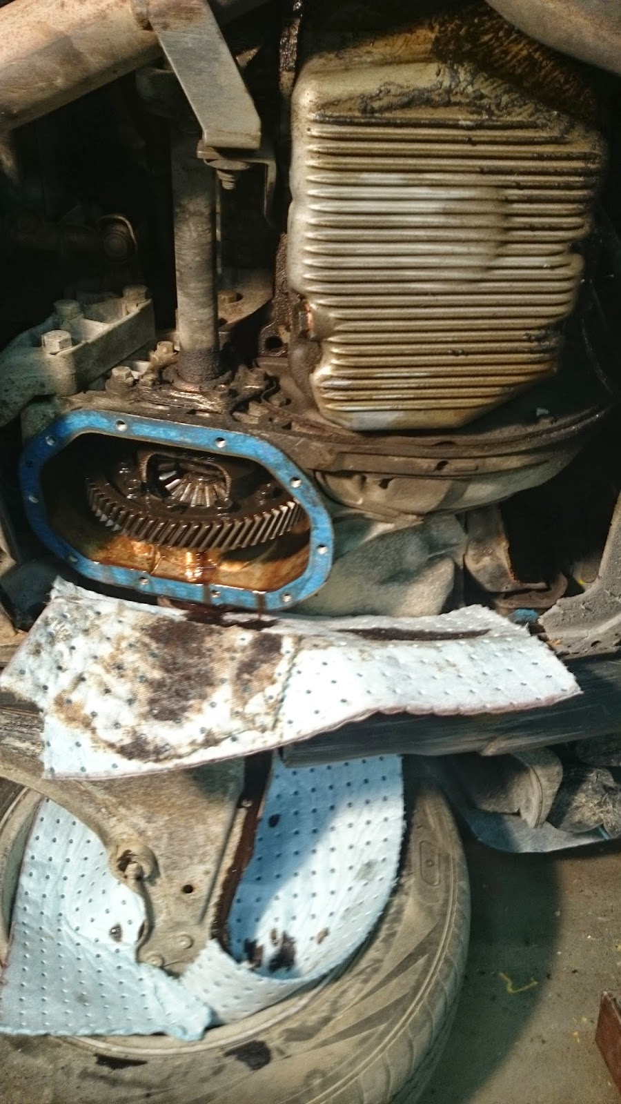 Här skruvar min bror upp locket till växellådan så vi kan svetsa diffen.