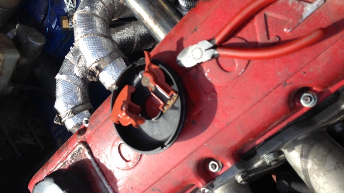 Senare konstaterade vi att servoremmen hade hoppat, kommit mellan kamremmen så att den kuggat över. Då har oljepumpens drev gått sönder. Rotorn i fördelaren hade även gått i två delar därav tvärstannade bilen.