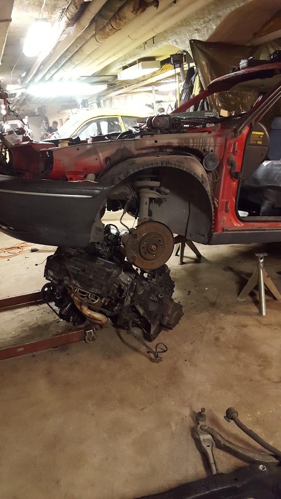 Vi lyfte Saab 900ans kaross och tog motorn underifrån. Nu återstår lite renovering sen ska den in i en färdig folkrace kaross där motorn gått sönder tidigare i sommar.