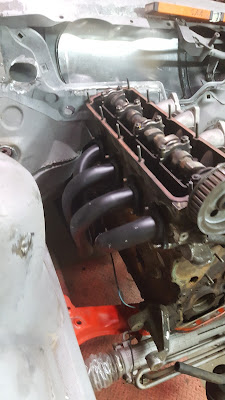 Vi har satt på extraktorröret för att kunna se hur vi ska placera motorn för att allt ska få plats. Det blir trångt med avgassystem och mellanaxel.