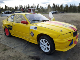 Vi hade ju tänkt köra en racingspecial på söndagen så vi började repa bilen för fullt. Vi lagade skuffen medans pappa och Anders åkte till Luleå för att köpa en ny oljetrycksgivare. Vi fortsatte laga bilen när de kom tillbaka och upptäckte nu att stötdämnparfästet var trasigt också. Efter mycket om och men så fick vi karossen som vi ville ha den o åkte ut på ett flygfält i närheten o testade bilen. Den gick bra kändes det som men den rök blått och vi valde då att inte forsätta helgen tävlingar.