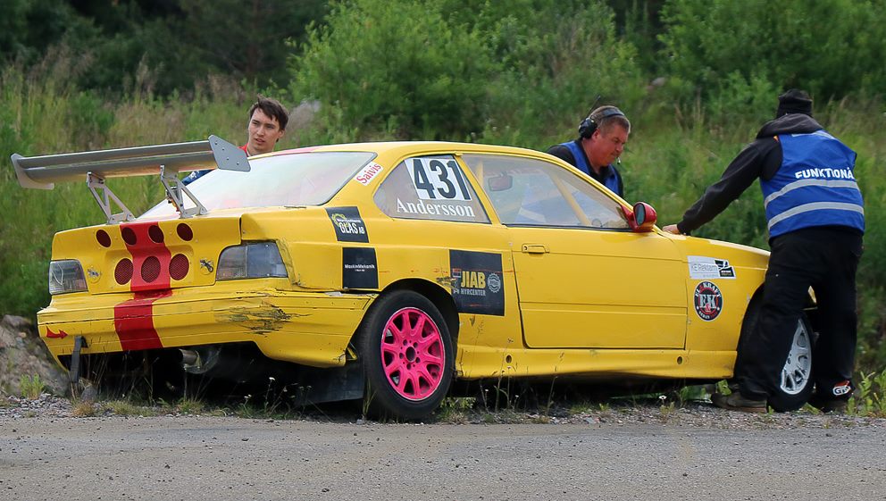 Det här var inte alls min dag, fick inte till starterna eller körningen alls som jag ville. Vi tittade över servostyrningen men insåg att det inte var mycket att göra inför dag 2. Vi tog helt enkelt bort pumpen och tömde systemet på olja för att få den bättre till Norrlandsveckans tävling dagen därpå. Var nu less på att bilen inte skulle fungera till 100.