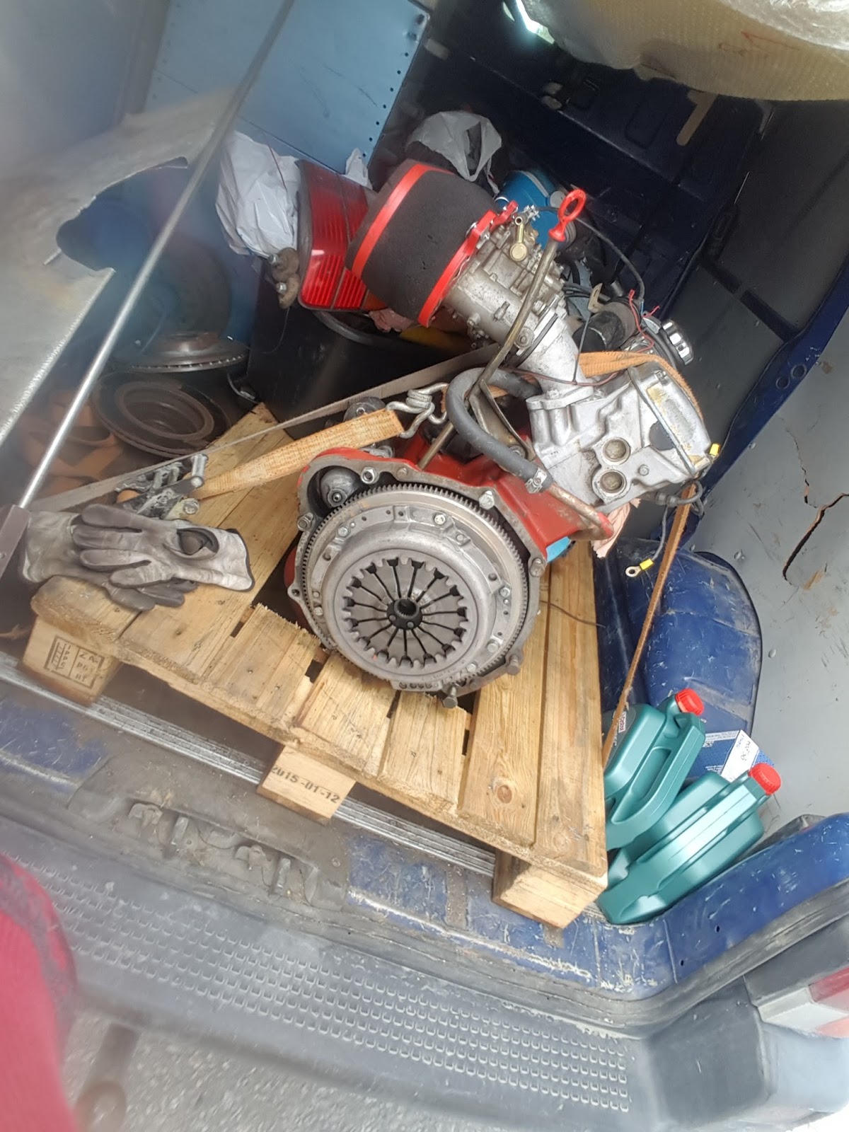 Medans vi var och hämtade motorn hade min Farbror Anders skruvat lös den trasiga motorn. När vi kom hem vid kl 15:00 var det bara att börja skruva. Vilken hjälteinsats hela det här projektet var. På Torsdag kväll dagen efter att min motor hade skurit hade vi åkt 90+ mil och hämtat en ny, installerat den och provkört. Snacka om att vi var nöjda när vi väl fick gå och sova och var redo för avfärd mot Piteås tävlingshelg. Innan avfärd bytte vi bromsklossar på Transporten (dragbilen) och då var en kloss helt borta. Dom andra var inte i så dåligt skick så det var ett väldigt konstigt fel att den lossnat.