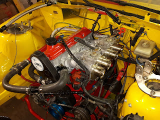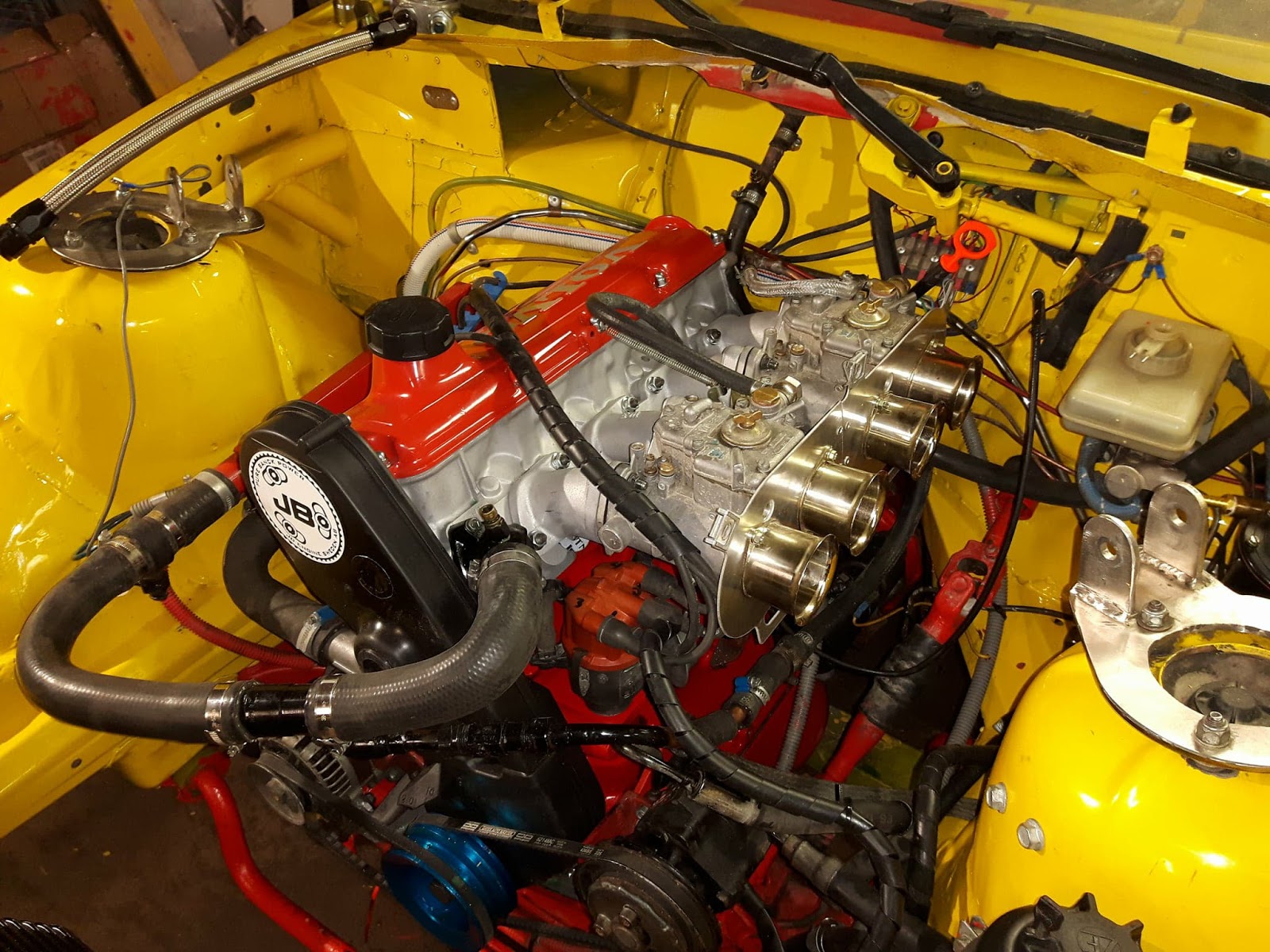Montering av motor och växellåda i ett paket gick riktigt bra. Inga konstigheter alls, men det är inte något man kan göra ensam, vi var 3st som hjälptes åt att hinka i motorn. Såklart med hjälp av en motorlyft. Motorn kommer från JB Engine, det enda som är kvar från min gamla motor är remhjulet och förgasarna. Allt är nytt annars!