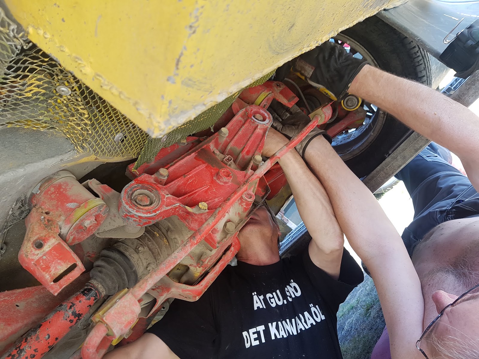 Vi hade ganska mycket jobb innan vi var klara för Piteås tävling, eftersom vi hade bokat camping så vart det också där vi skruvade. Med en provisorisk arbetsställning som var ordentligt uppsäkrad så vågade vi oss in under bilen för att ta lös klumpen, byta ut bulten som gått av och sen stoppa tillbaka allt. Låter kanske lätt men tar sin lilla tid att göra.