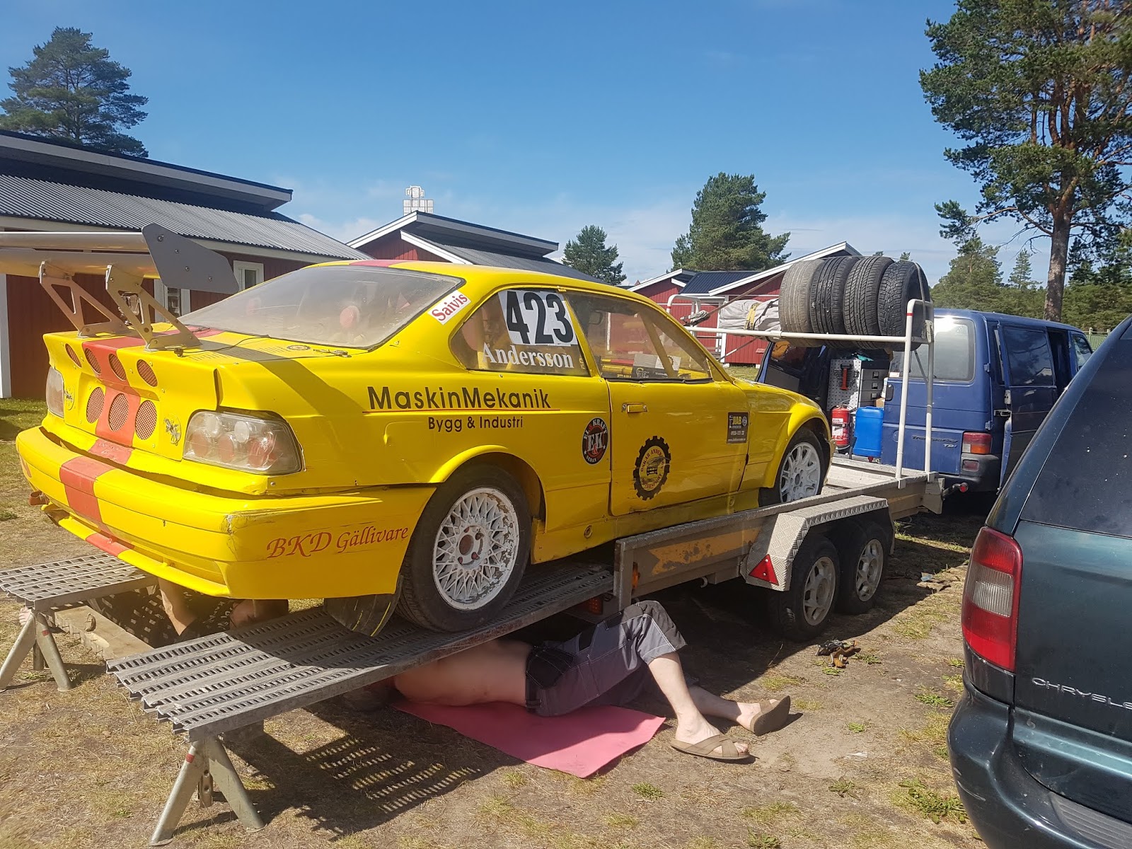Vi hade ganska mycket jobb innan vi var klara för Piteås tävling, eftersom vi hade bokat camping så vart det också där vi skruvade. Med en provisorisk arbetsställning som var ordentligt uppsäkrad så vågade vi oss in under bilen för att ta lös klumpen, byta ut bulten som gått av och sen stoppa tillbaka allt. Låter kanske lätt men tar sin lilla tid att göra.