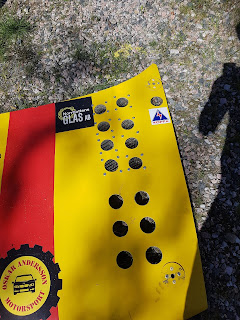 Vi hade lite plastskador att fixa efter Piteås tävling, ett lyse som hade lossnat. Sen så "trimmade" vi med extra hål i huven, förgasarna får mer luft och det är ju inte helt fel tycker vi! Blev en rejäl rad med hål som vi sedan la nät för. Vid behov ska vi även stoppa dit filterduk.